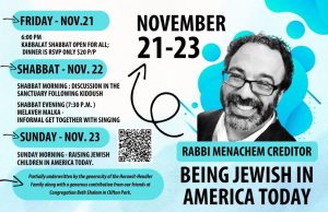 Friday, November 21st, there will be no services on site at Congregation Beth Shalom, we will join with Congregation Ohav Shalom in Albany for services and the Scholar-in-Residence weekend with Rabbi Menachem Creditor which we are co-sponsoring.