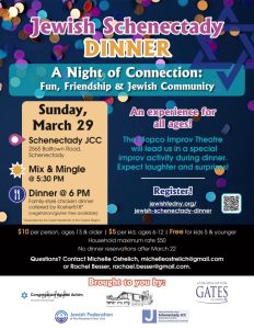 Join us for a Jewish Schenectady Dinner on Sunday, March 29, at the Schenectady JCC for a night of fun, friendship, and community! The Mopco Improv Theatre will lead a special, all-ages improv experience sure to spark laughter and connection.