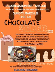 CONGREGATION BETH SHALOM invites you to Join Us for Some Sweet Pre-Passover Fun